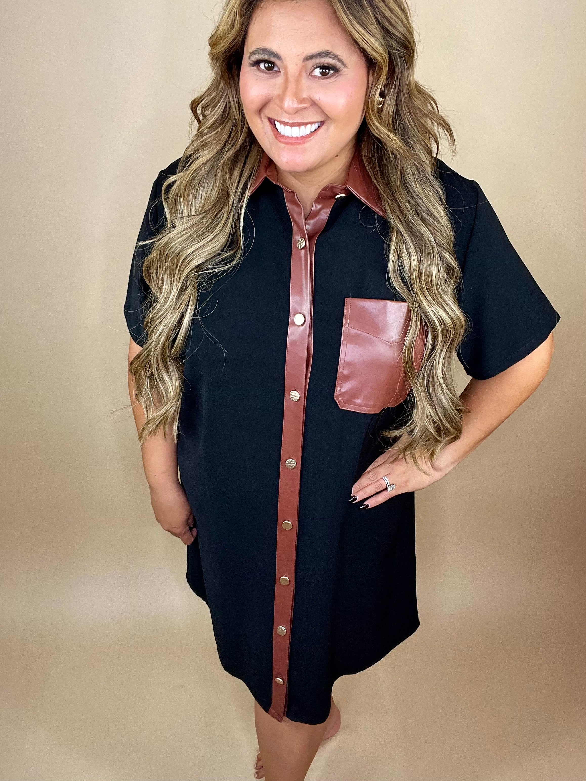 If you're looking for a fall dress that's both stylish and comfy, then you'll want to add our Mean Business Dress to your closet. This black-block dress is perfect for any occasion, whether you're headed to the office or on date night. The collar and chest pocket give it a classic shirt-dress look, while the faux leather adds a touch of elegance. Pair it with our boots to complete the look.