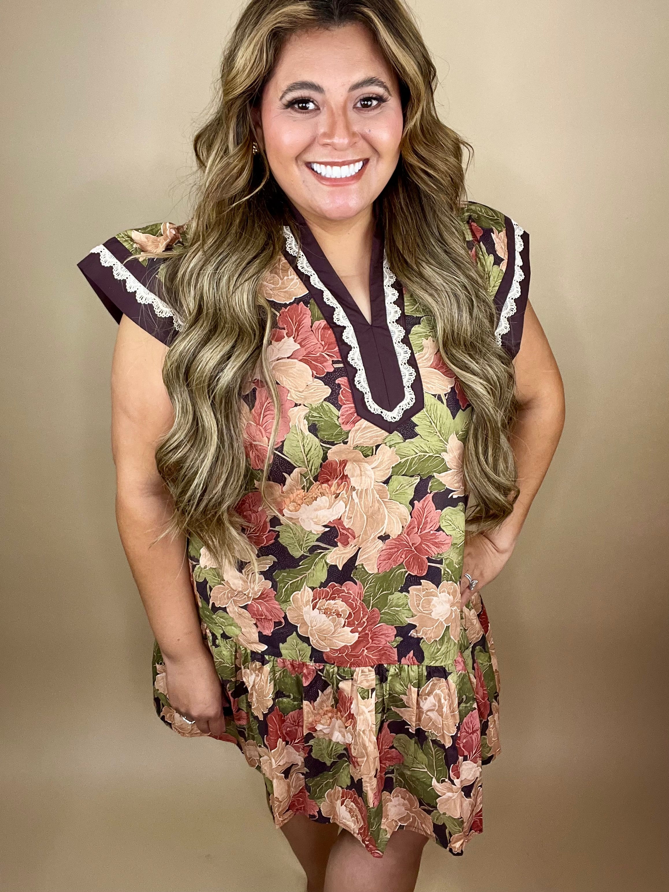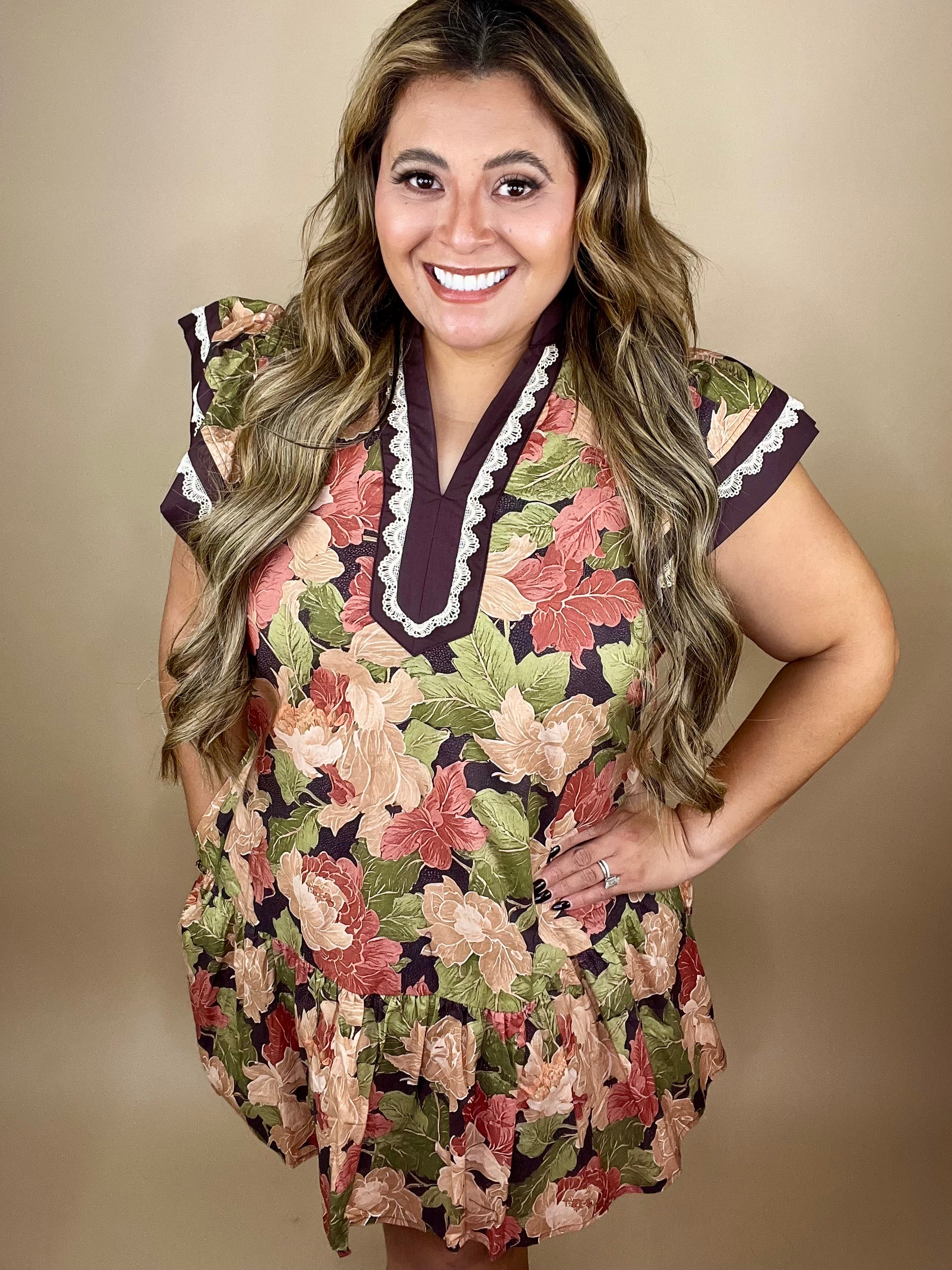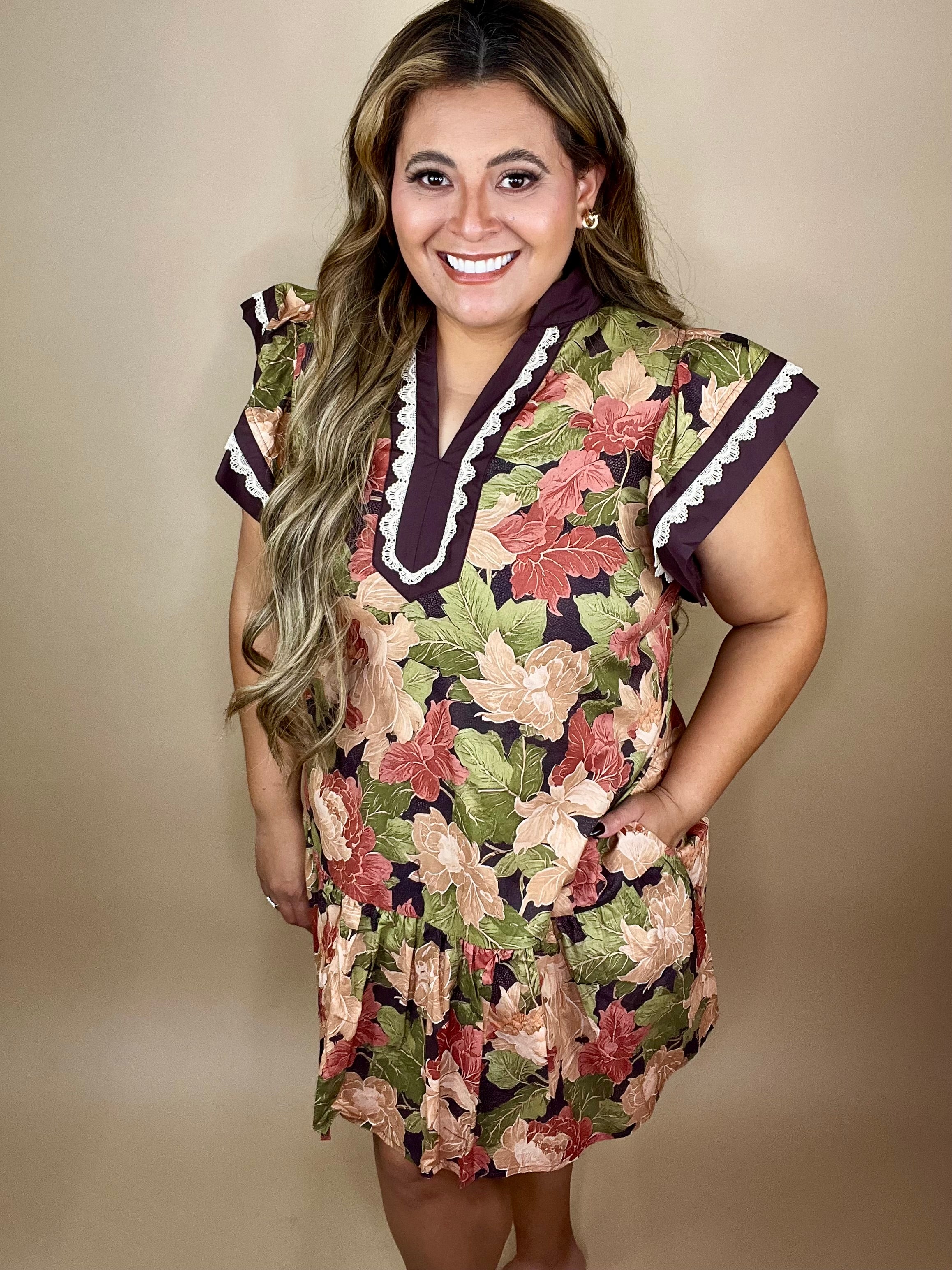 Step into your season with the Mindi Dress — a soft, flowy silhouette that reflects the gentle transformation God brings in every chapter of your life. With a rich fall-toned floral pattern, flutter sleeves, pockets, trimmed in lace, and a relaxed tiered hem, this dress is designed to remind you that grace looks good on you.