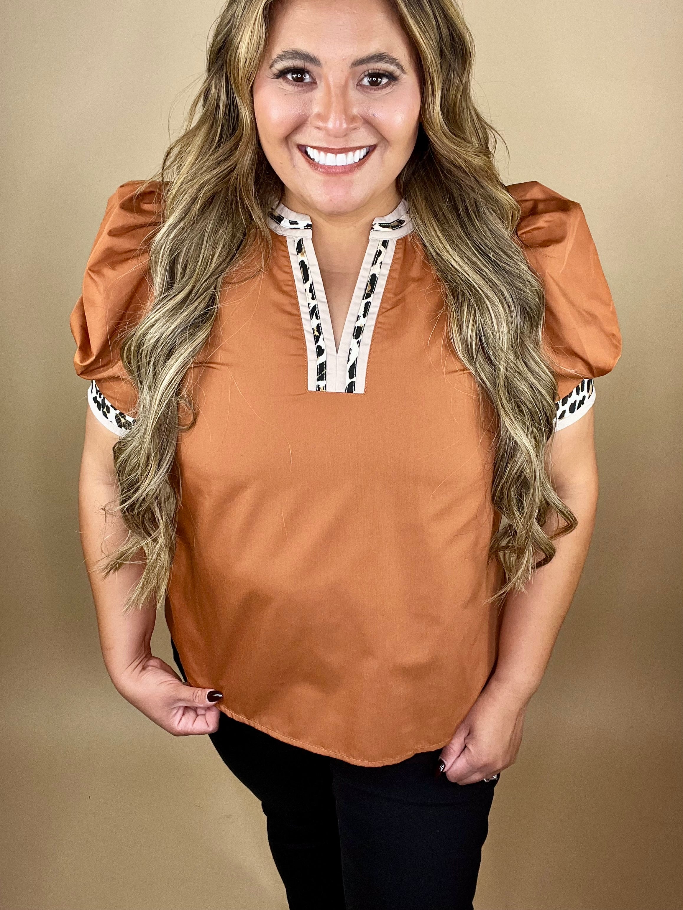 With confidence in every detail, the Mandy Top is for the woman who knows she's called to stand out. Crafted in a sleek caramel fabric with statement puff sleeves, it’s trimmed with a pop of personality — soft leopard-print contrast at the sleeves and neckline — for just the right touch of fierce femininity.