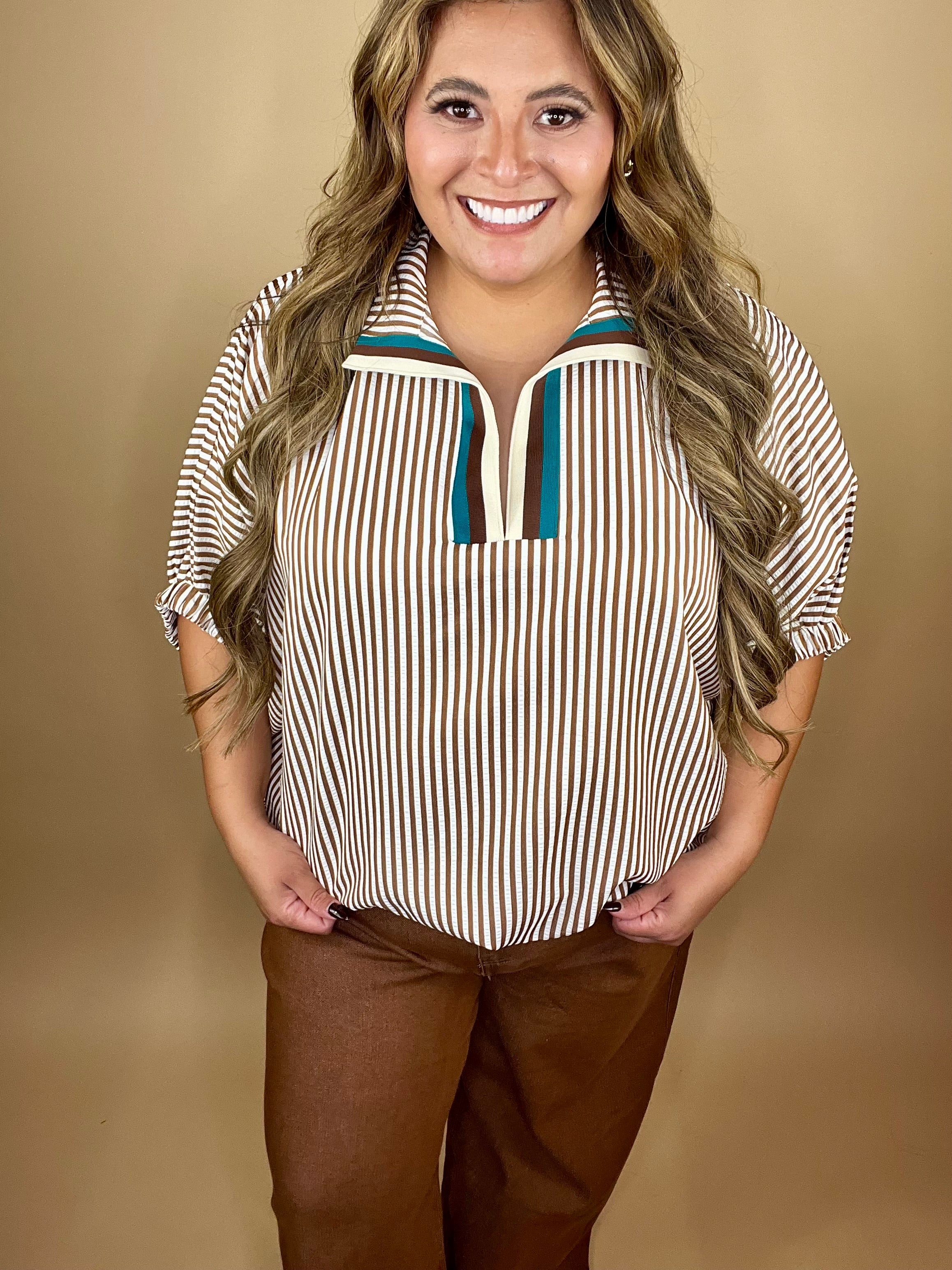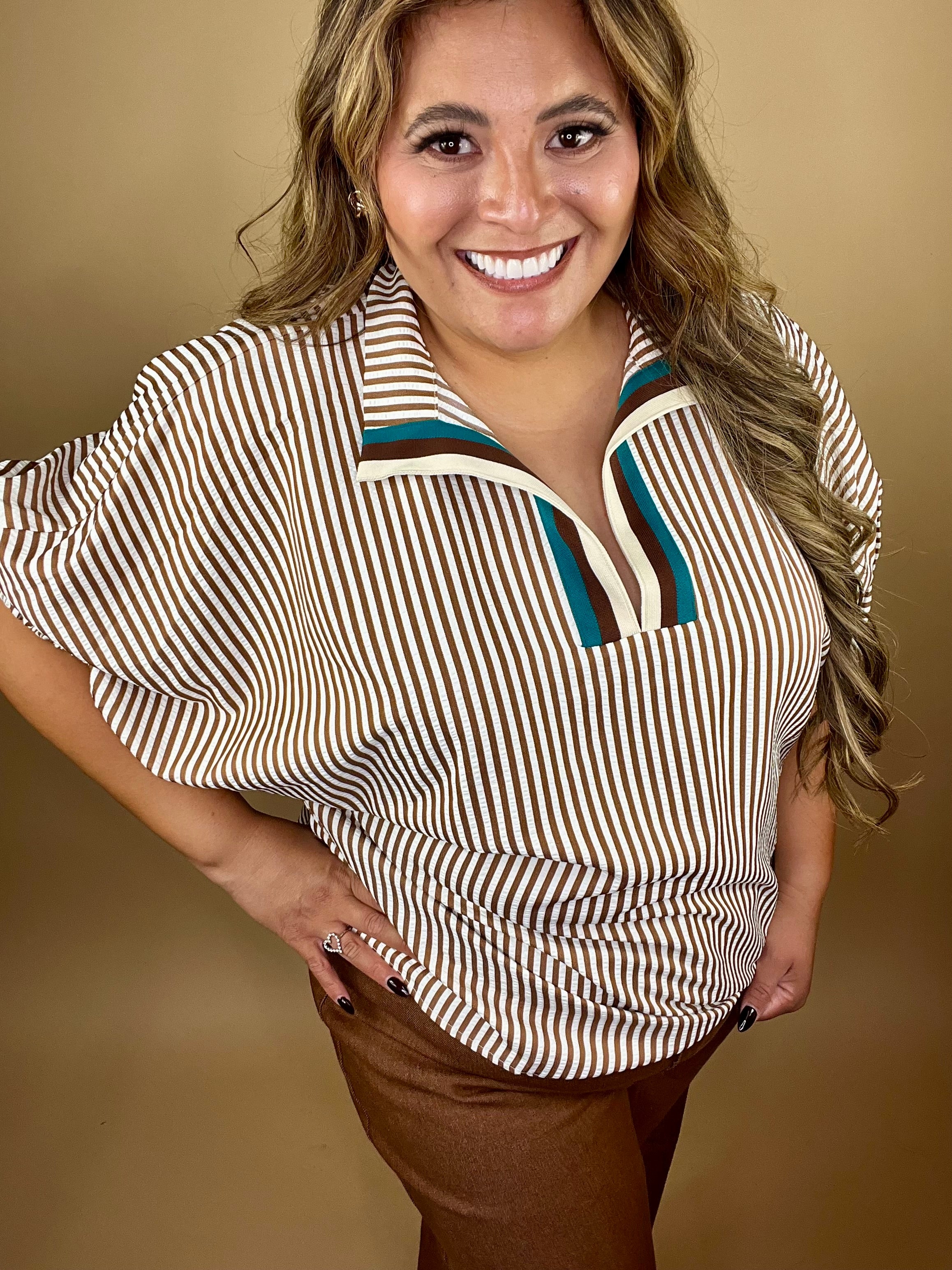 Elevated and effortless, the Mila Caramel Top is for the woman who knows she’s covered in God’s favor. With vertical caramel-and-cream stripes, a bold pop of teal at the neckline, and relaxed rolled sleeves, this piece blends polish with ease — just like the woman walking in both faith and freedom.