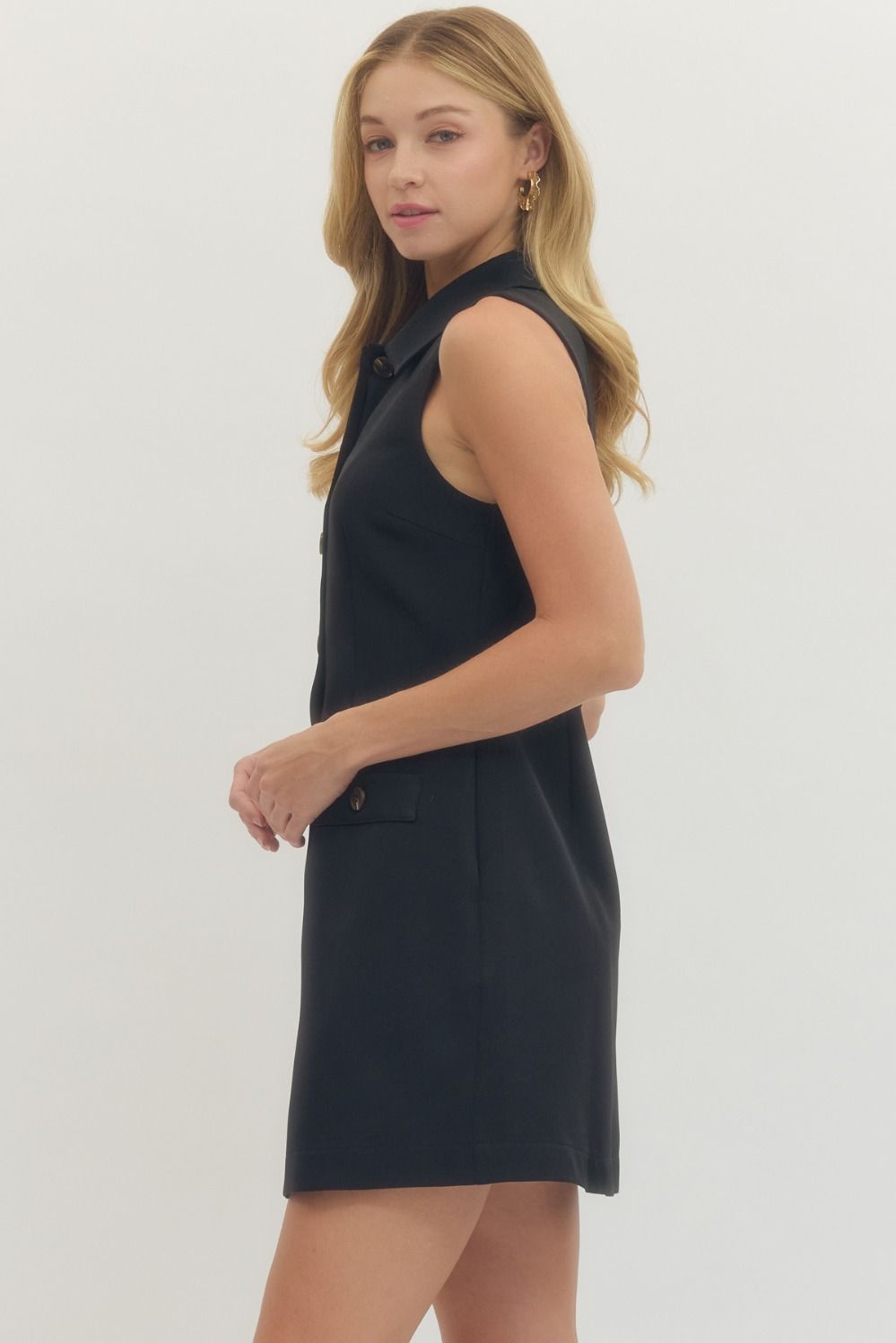 A classic black dress you’ll reach for again and again. This piece is clean, polished, and effortlessly flattering with its structured button-front design and tailored silhouette. The sleeveless cut keeps it light and versatile, making it easy to style for any season.
