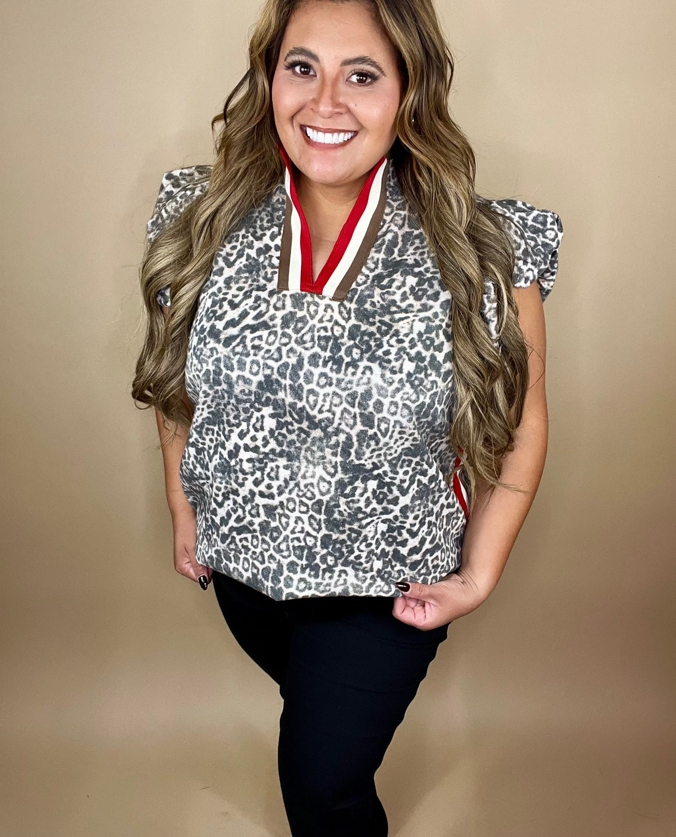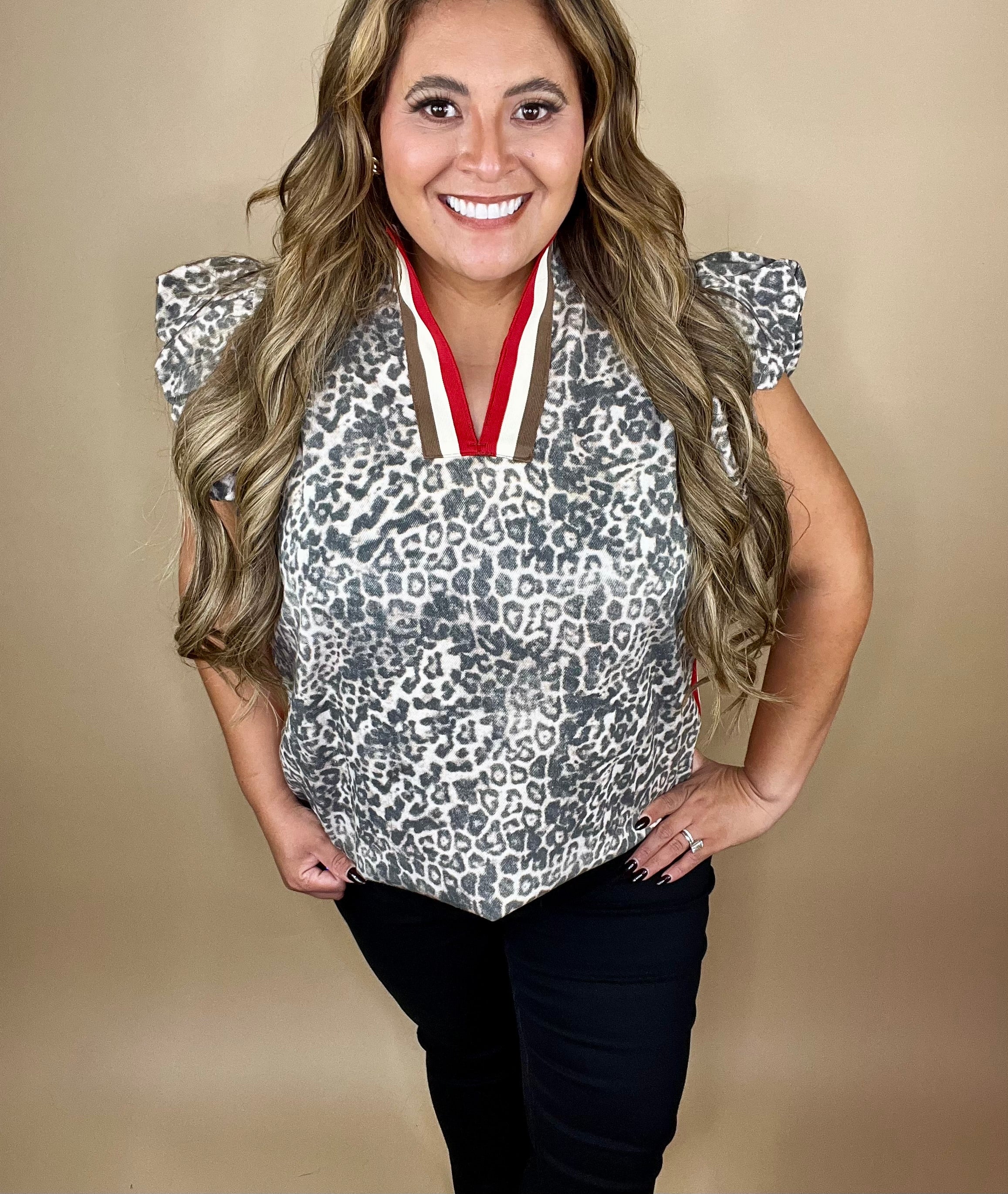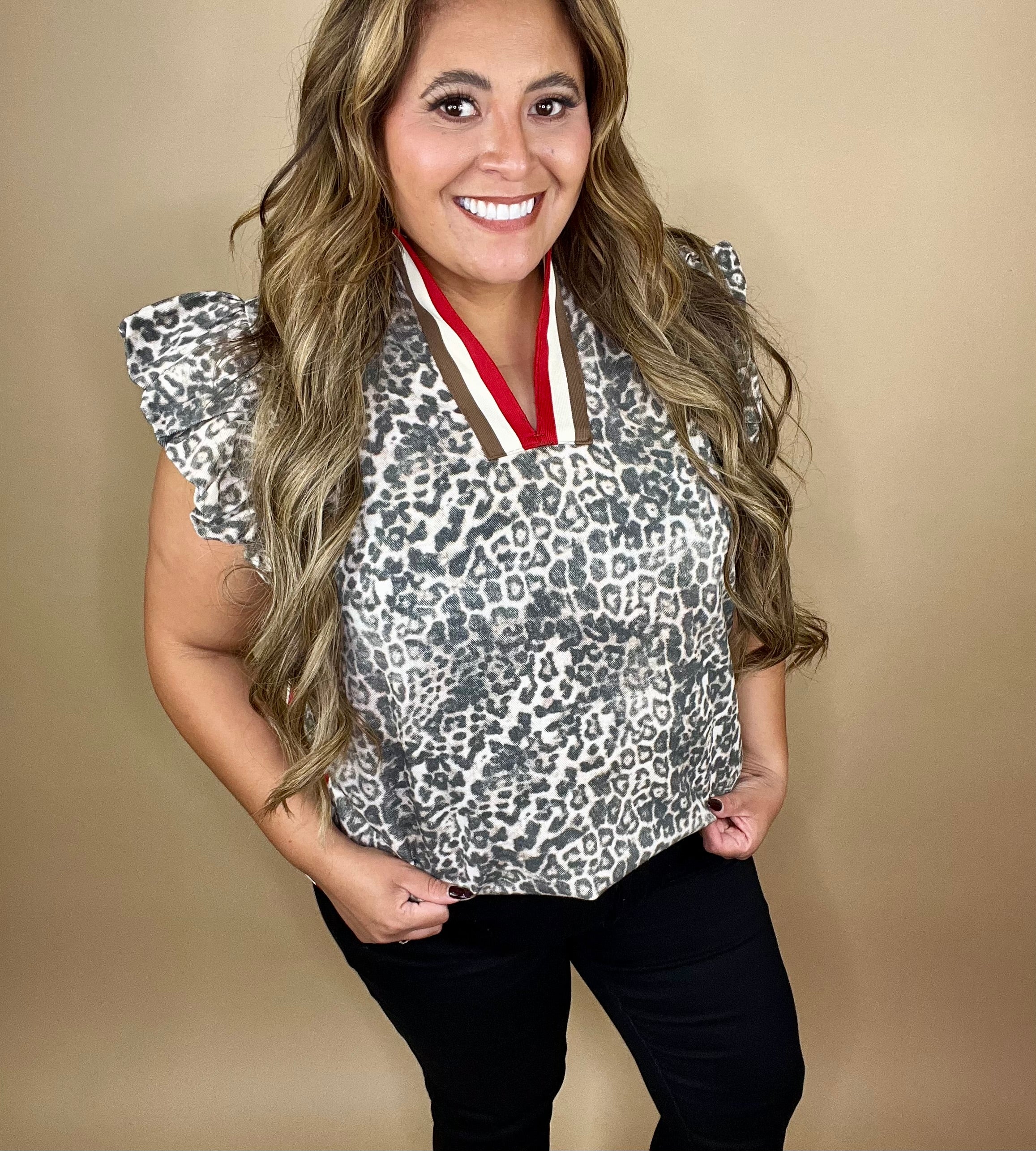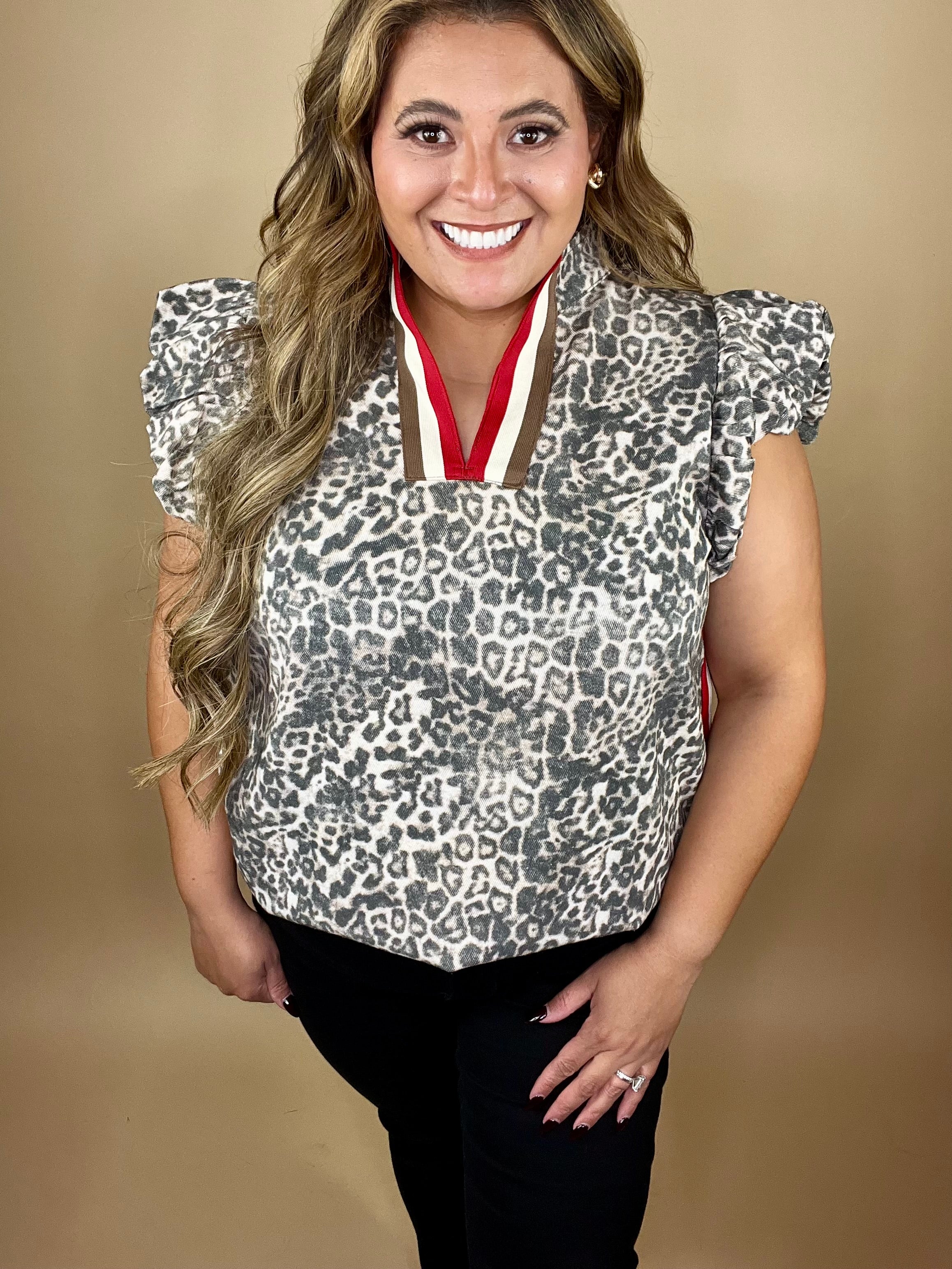 Be bold in your faith and fearless in your style with our Ferni Top. This effortlessly chic blouse features a subtle grey leopard print, playful ruffled sleeves, and a pop of red and cream trim that makes a statement — just like the light God called you to shine.