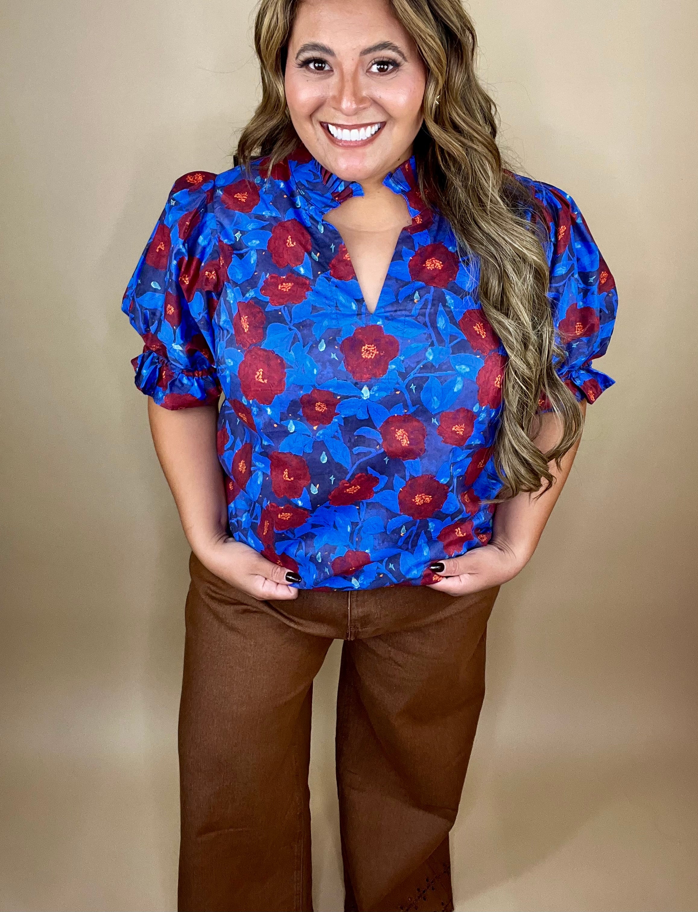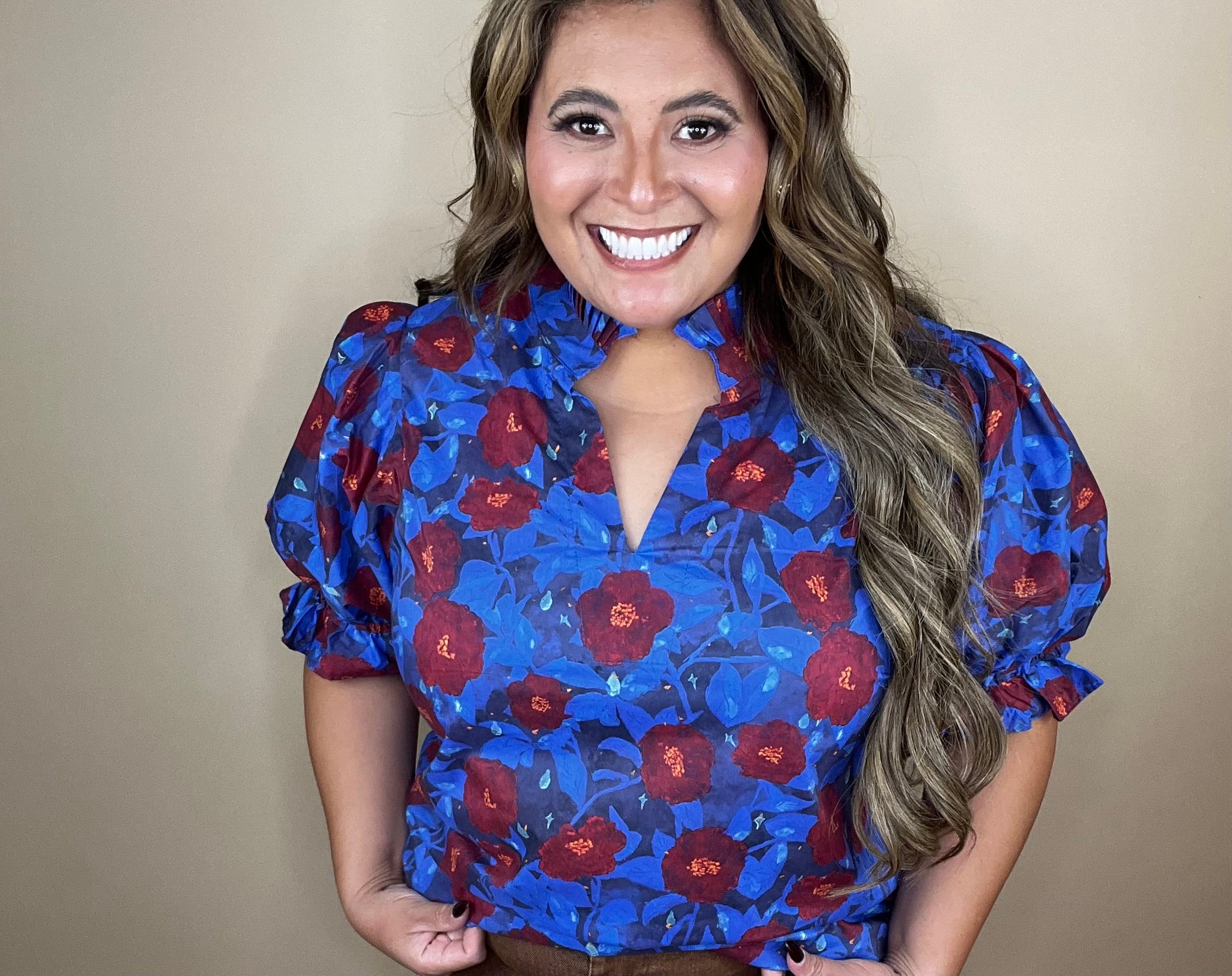 Let your faith bloom just like the vibrant florals on our Verna Top. This stunning blouse features a bold blue and red floral print that reminds us of the beauty God places all around us — and within us. The playful puff sleeves, featuring elastic, and the flattering notched neckline add a touch of grace and charm, making it perfect for days when you want to feel both confident and covered in His love. Pair it with jeans for a casual day of errands or dress it up for brunch with friends.